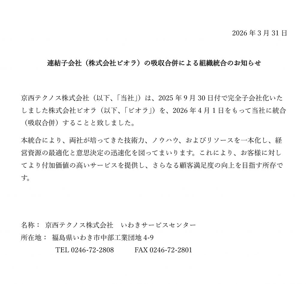 連結子会社(株式会社ビオラ)の吸収合併による組織統合のお知らせ